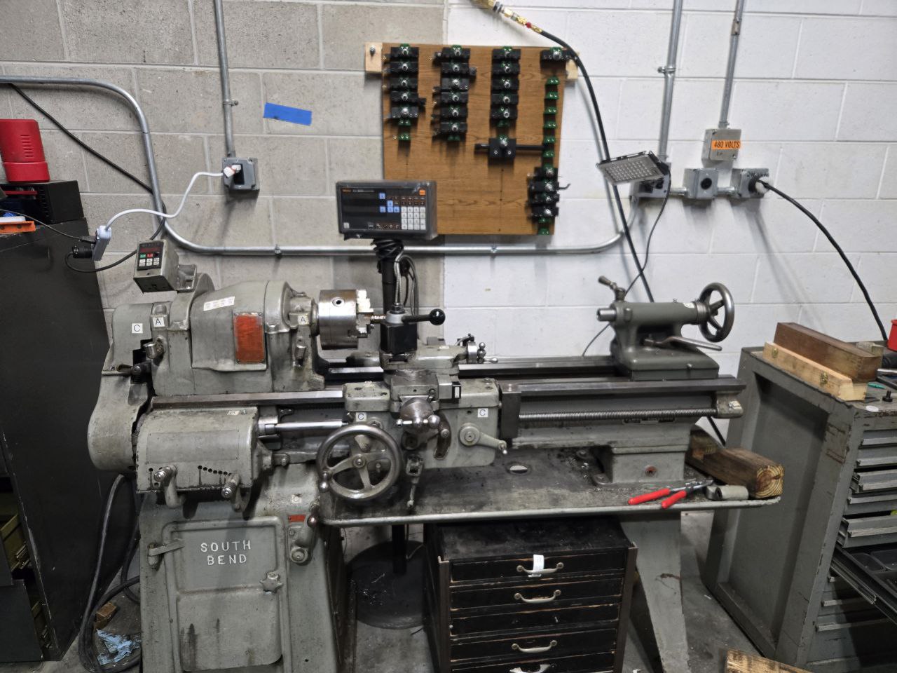 Traditional South Bend lathe, don't let its age fool you; it's still just as accurate, and strong as the day it was made, modernized with a new drive system to allow for variable speeds and better surface finishes.